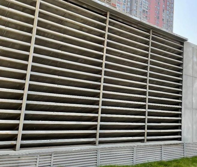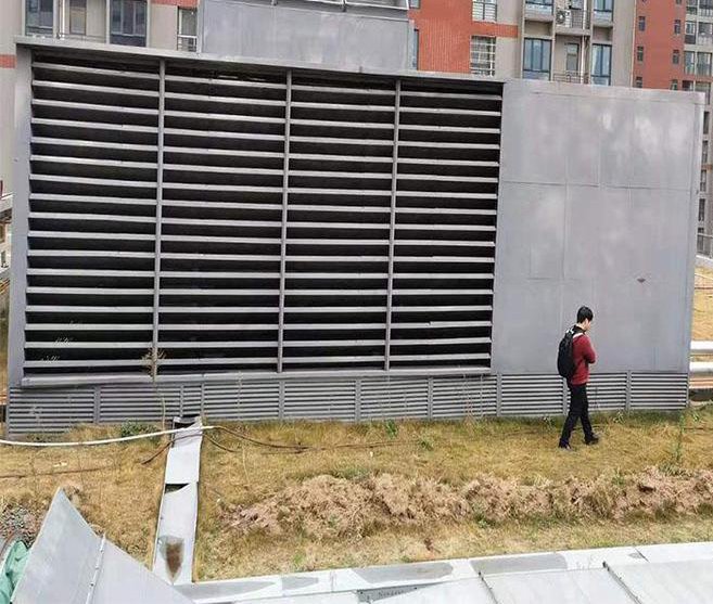 3、進(jìn)氣消聲。空調(diào)外機(jī)進(jìn)氣也是降噪的重點(diǎn)之一。由于空調(diào)機(jī)組設(shè)備較大,排氣量與進(jìn)氣量都是非常巨大的,但是空調(diào)設(shè)備的壓縮機(jī)產(chǎn)生的噪聲值也是非常的高,既要保證降噪效果又要保證進(jìn)氣,所以使用進(jìn)氣斜插式消聲百葉和進(jìn)氣企口。